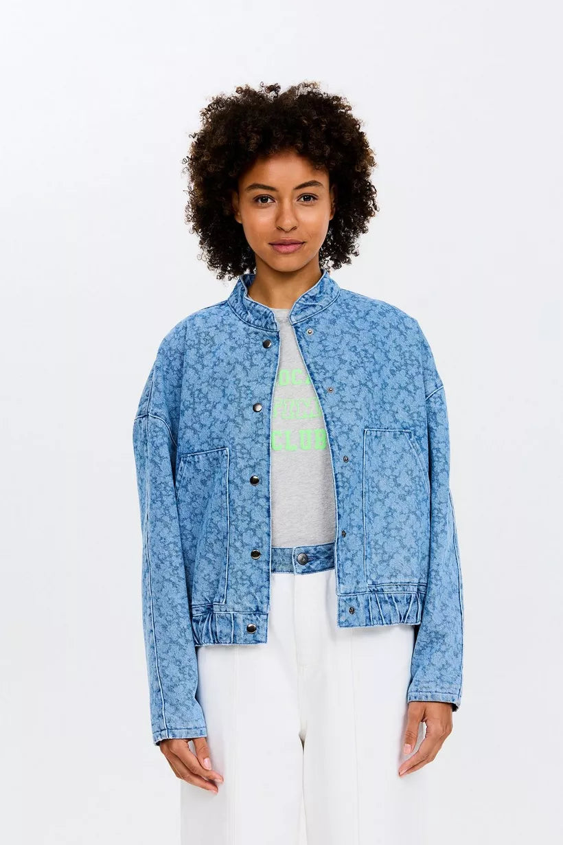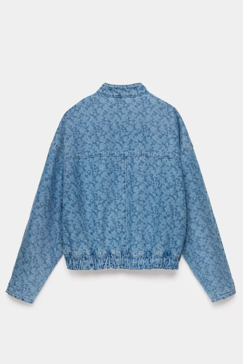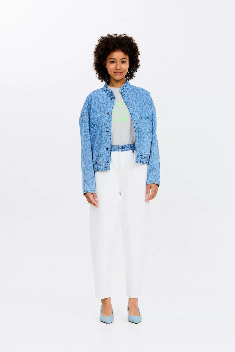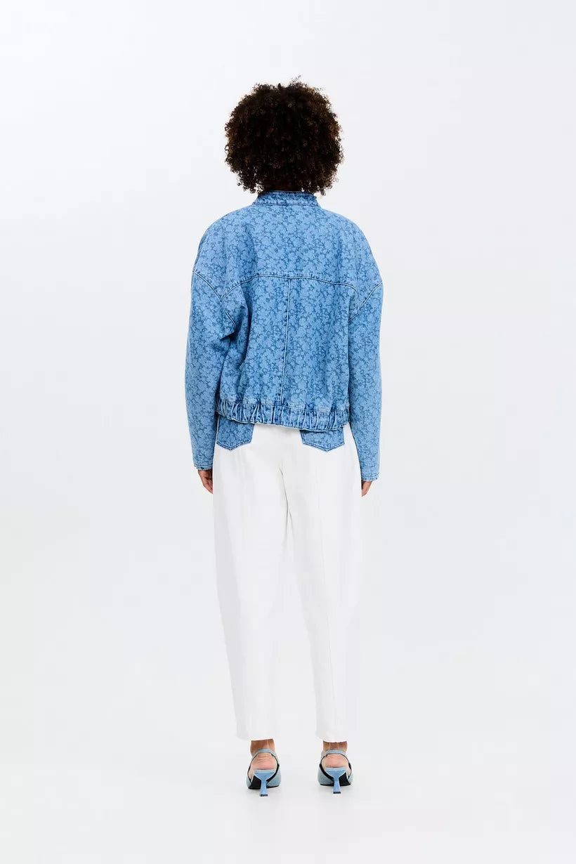 Not your average denim jacket! Bereid je voor op complimenten met deze blauwe, korte jeansjas voor dames in de stijl van een bomber jacket. Deze korte jas kreeg een unieke touch door de lichte, gelaserde bloemenprint in combinatie met een relaxte fit. Afgewerkt met zakken, een elastische tailleband en zakken. Matching broek verkrijgbaar.