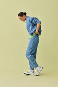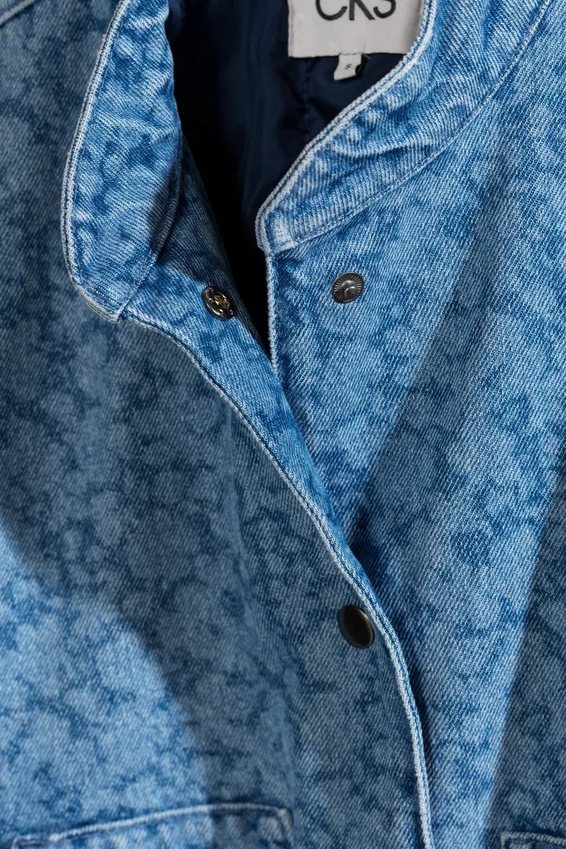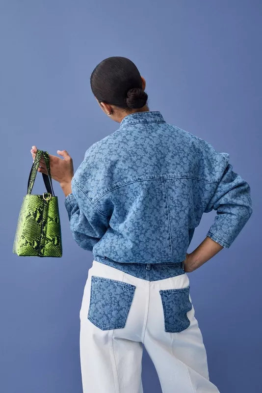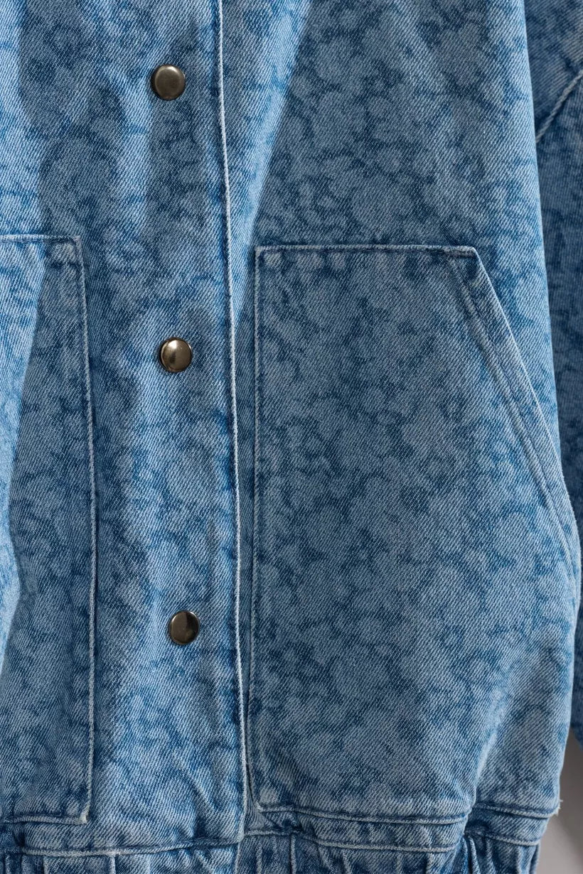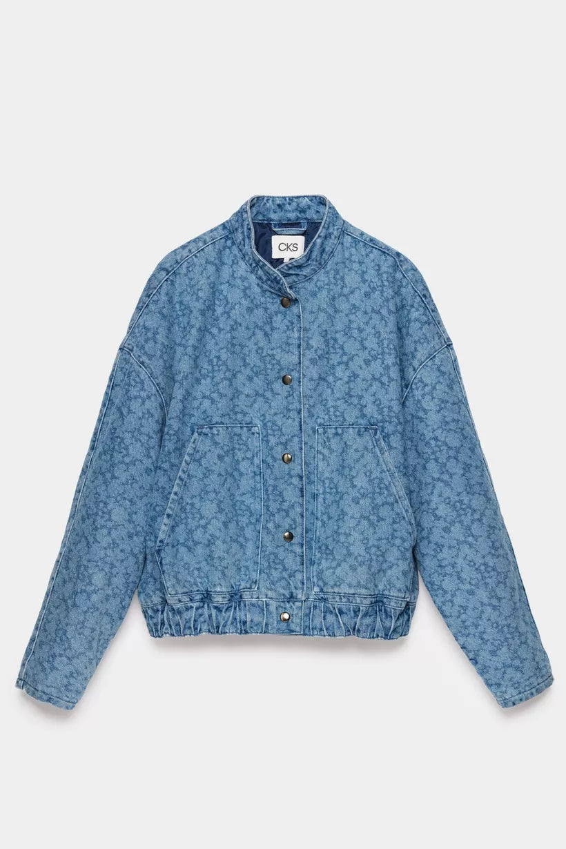 Not your average denim jacket! Bereid je voor op complimenten met deze blauwe, korte jeansjas voor dames in de stijl van een bomber jacket. Deze korte jas kreeg een unieke touch door de lichte, gelaserde bloemenprint in combinatie met een relaxte fit. Afgewerkt met zakken, een elastische tailleband en zakken. Matching broek verkrijgbaar.