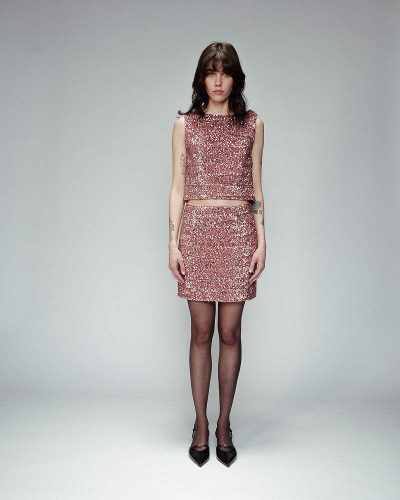 Complete the look : The ORLY sequin top is worn with the OSBORNE short skirt, an audacious total sequin look that creates a modern and radiant appearance. This fashion piece can also be worn with jeans to incorporate into everyday wear.