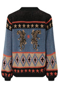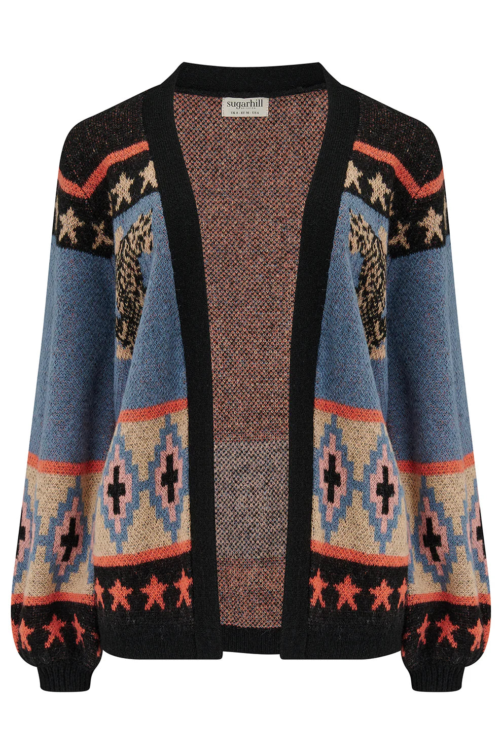 Muted blue and black knit with orange and beige patterned panels, and two climbing tigers on the front and back of the cardigan