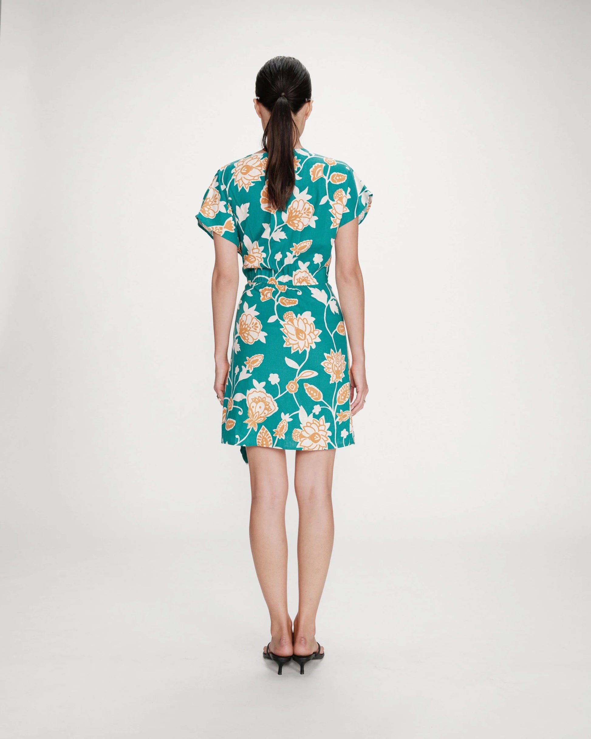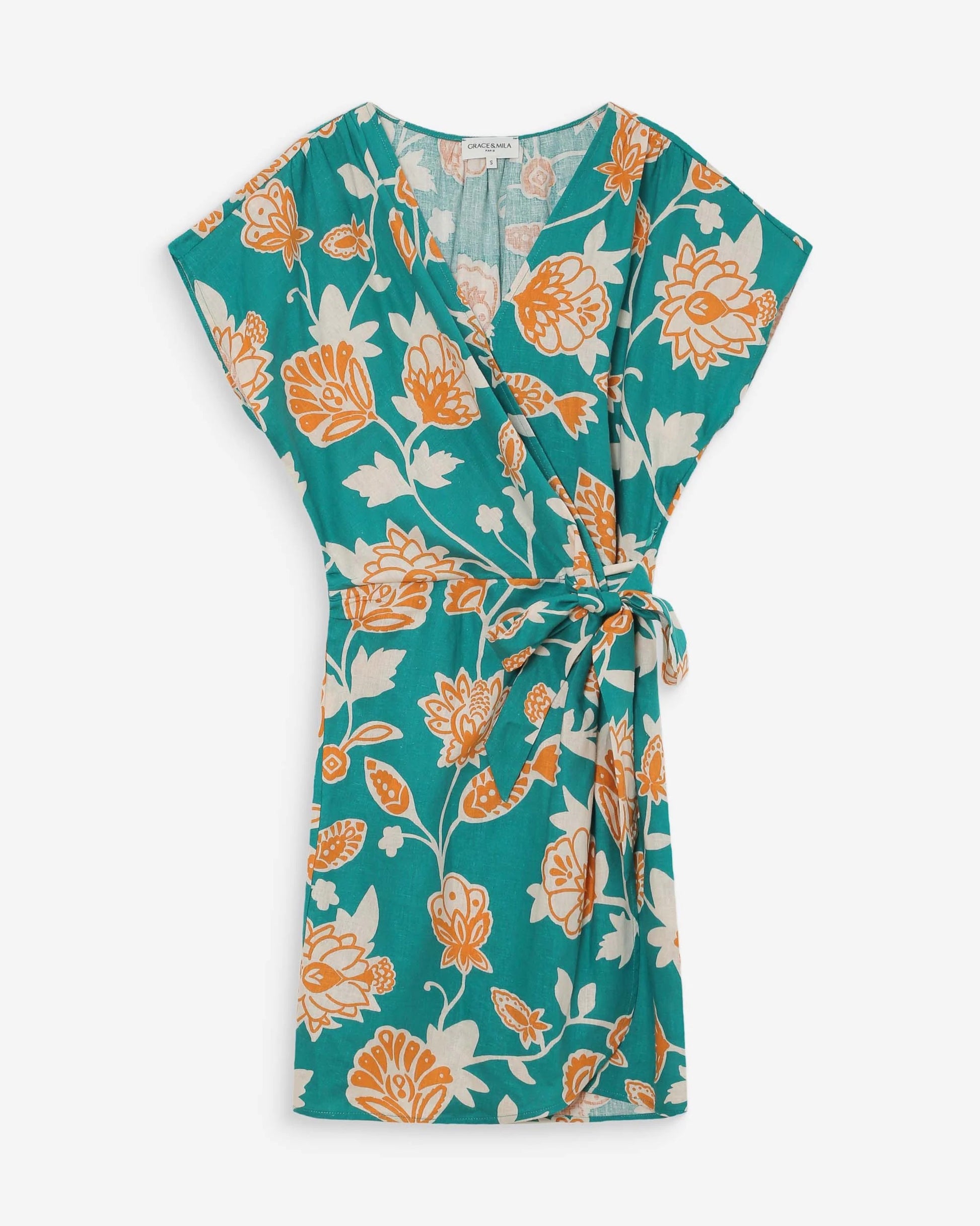 The VELORA short dress features a wrap cut fitted at the waist. Its floral print, crafted from a fabric containing linen, gives it a look that is both chic and creative. The short sleeves offer optimal comfort. The tie belt and V-neckline enhance a feminine and delicate silhouette.